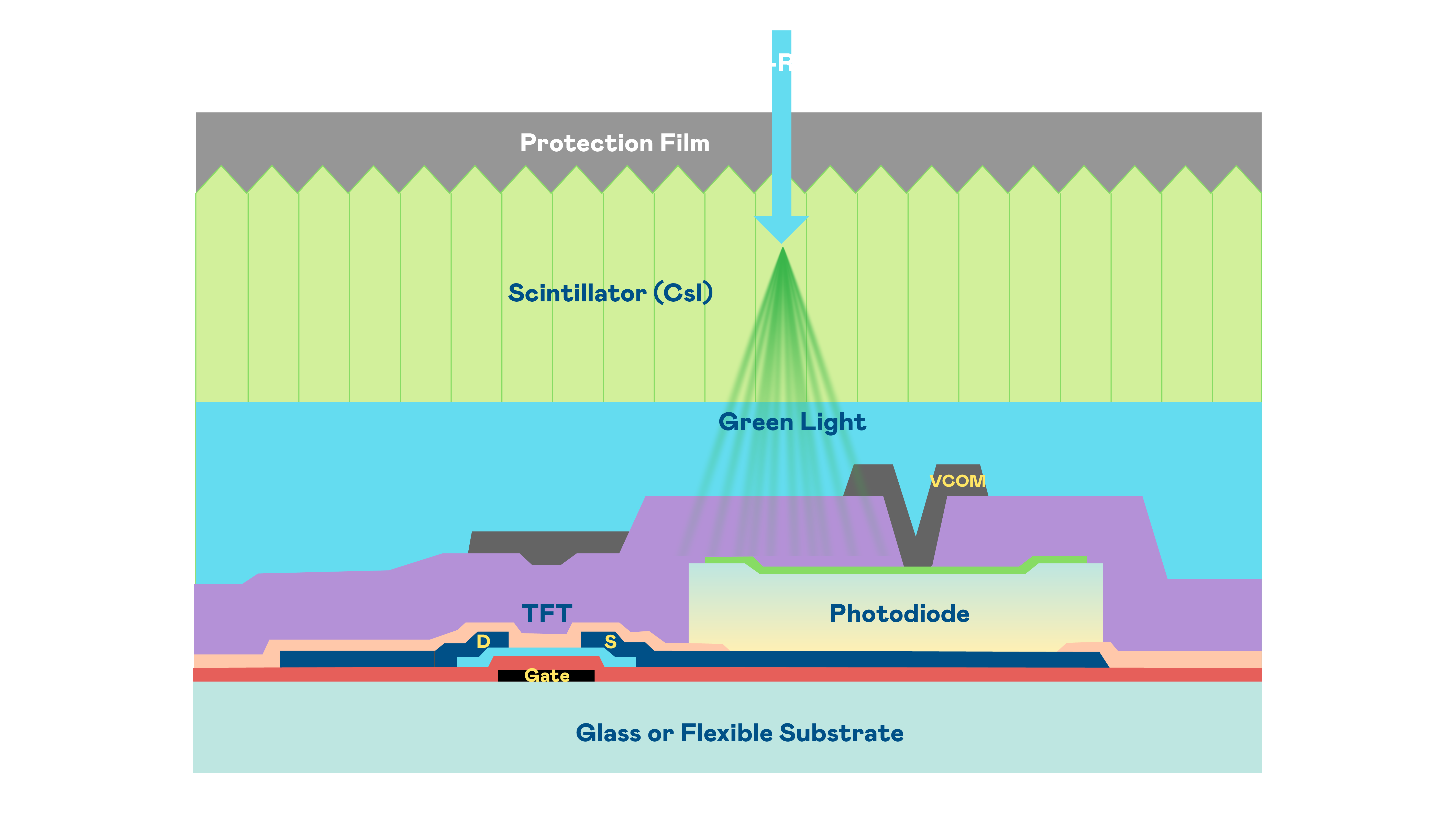 w66利来的X光影像感测阵列使用薄膜电晶体 (TFT) 作为每个像素的读取开关,搭配光电二极体(Photodiode)的光电转换元件,用以感测X光影像讯号。